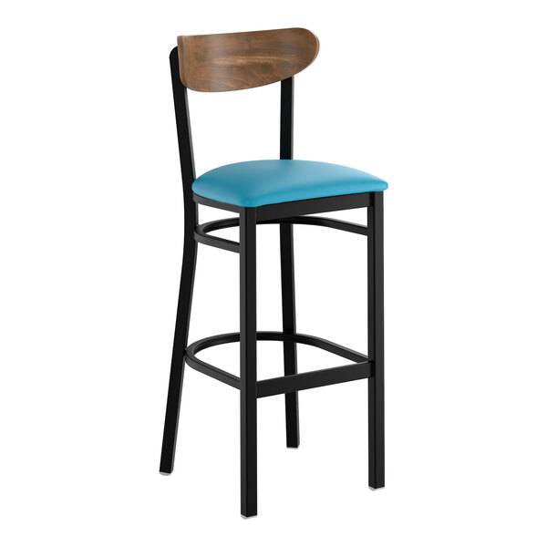 Boomerang Black Finish Bar Stool with Blue Vinyl Seat and Antique Walnu...