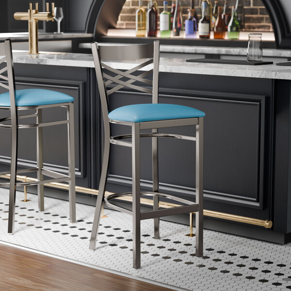 Boomerang Clear Coat Finish Bar Stool with Blue Vinyl Seat and Antique ...